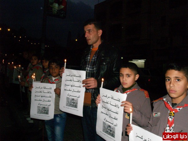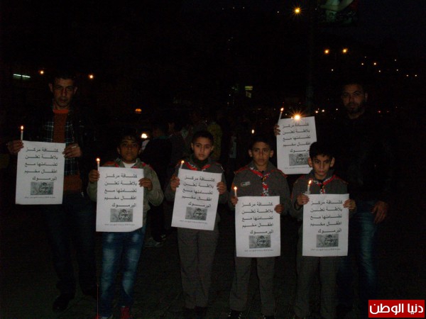 اضاءت مجموعة كشافة ومرشدات الشهيد ياسر عرفات التابعة لمركز شباب بلاطة الشموع تضامنا مع أطفال مخيم اليرموك أمام مخيم بلاطة - نابلس.