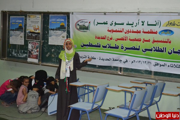 أقيم يوم أمس بكلية التربية بجامعة الحديدة مهرجاناً جماهيرياً طلابياً لنصرة طلاب فلسطين والذي نظمتة منظمة مجددون التنموية بالتنسيق مع جمعية الأقصى بفرع الحديدة حضرة حشد كبير من الشباب والطلاب والأعلاميين .وفي المهرجان الذي