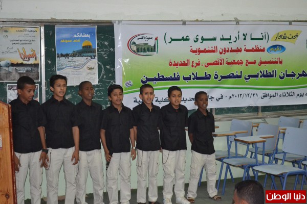 أقيـم تحت شعار " أنا لأ اريد سوى عمر بن الخطاب " ألقيت عدد من الكلمات من قبل جمعية الأقصى بفرع الحديدة القاها عبدالولي العبدلي وعن منظمة مجددون القاها سلطان العزيزي أشارت جميعها على أهمية هذا المهرجان للتعبير عن تضامن وتكاتف أبناء الشعب اليمني العظيم مع أخواننا الطلاب في فلسطين ومد يد العون لنصرتهم ومساندتهم والوقوف بجانبهم لما يحاك بهم من مؤامرات من قبل الجيش الأسرائيلي الذي لازال يمارس ضدهم القتل والحصار اليومي .