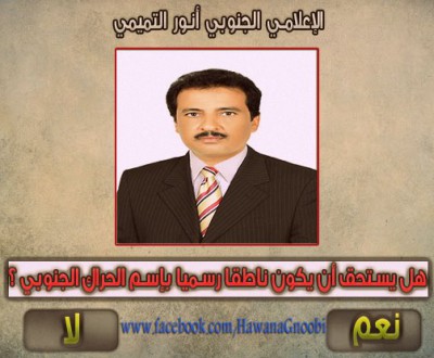 أعلن عدد من الإعلاميين البارزين في عدن العزم على تزكية ترشح الأخ أنور التميمي ناطقاً رسمياً للمجلس الأعلى للثورة الجنوبية على إثر إبدائه لرغبته تولي هذا المنصب عبر الحملة التي أطلقها في موقع التواصل الإجتماعي الفيسبوك