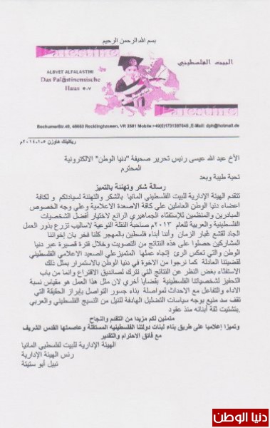البيت الفلسطيني المانيا .. رسالة شكر وتهنئة بالتميز لدنيا الوطن
