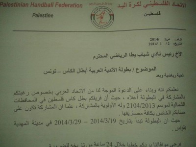 وقد جاءت هذه الدعوة لفريق كرة اليد التابع لنادي شباب يطا باعتبار انه بطل كأس فلسطين في كرة اليد للعام الثاني على التوالي، في المحافظات الشمالية 2013/2014.