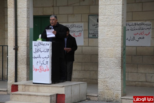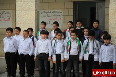 حيث ابتدأ الاحتفال بتلاوة آيات من الذكر الحكيم تلاها الطالب أسامة سليط احد طلاب المدرسة، يليه النشيط الوطني الفلسطيني، بحضور مدير المدرسة السيد سعد عويس والمعلمين، وممثلين