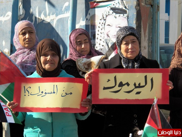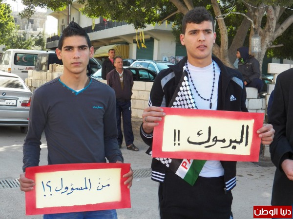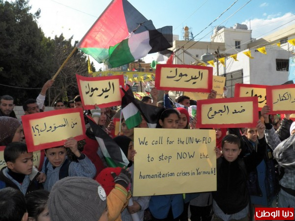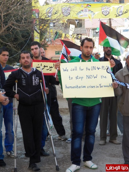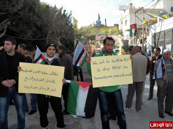 ورفع المعتصمون لافتات طالبت الانروا والامم المتحدة ومنظمة التحرير ببذل الجهود لانهاء معاناة ابناء مخيم اليرموك.