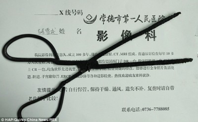 وقد هرع تشانغ الى المستشفى حيث عمل الأطباء على إزالة الملقط من راسه.