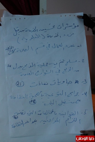 وقد دار حوار ونقاش بين الحضور من مواطنين والبلدية وقد تم في نهاية اللقاء الخروج بخطة عمل تضمنت معايير محددة وأنشطة لتنفيذها خلال العام بالإضافة إلى تشكل لجنة متابعة من البلدية والمواطنين لمتابعة تنفيذ الخطة والعمل على تحسين