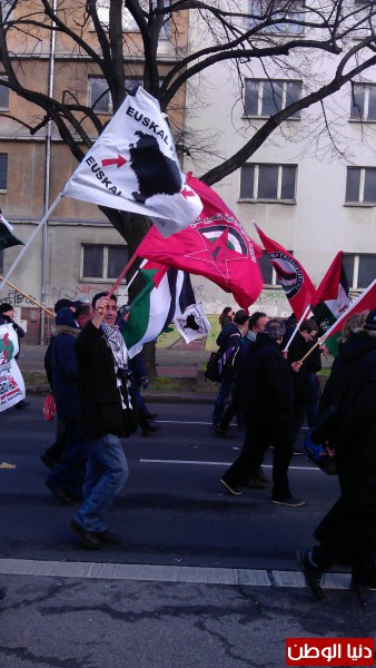 و قد انمزجت الوان العلم الفلسطيني الذي كان حاضراً و خفاقاً في هذه المسيرة مع الوان رايات الاحزاب و المنظمات و الحركات اليسارية من كل بقاع الارض و ذلك تأكيدا على اممية قضيتنا الفلسطينية و التي لاقت ترحيباً واسعاً من جانباغلبية المشاركين.