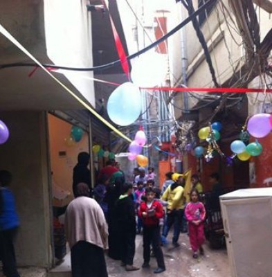 أقدم مجموعة من شبان مخيم برج البراجنة في العاصمة اللبنانية بيروت على تزيين ساحة الشهيد عرسان الهابط وسط المخيم.