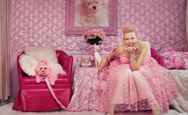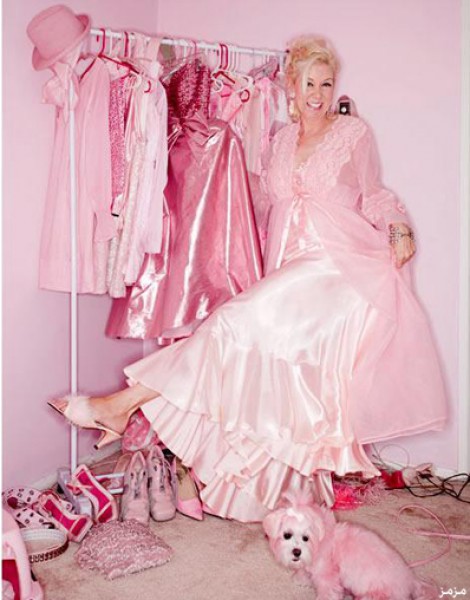 علاقَتُهَا معَ هذا اللونْ حميمةٌ فهُو صديقُهَا الأقرَب لأنّهُ لا يُفاْرِقْهَا للحظَةٍ ورُغْمَ ذَلِكَ لا تَمَلُّ مِنْهُ. تقول:”بدأ الأمر في عيدي العشرين وأنا أبلغ الخمسين اليوم، حينها إرتديتُ تنورة زَهرية وقميصاً باللون عينه، لم يكونا ذات أي أهمية، لكنني سمعت عدّة إطراءات عن أنني بدوتُ جميلَة ورائعة في هذا اللون.. خلال ذاك العام تخلّصتُ شيئاً فـ شيئاً من كل ملابسي التي لم تكن زهريةً أو بيضاء، وأعطيتُ كلّ ما كنت أملكه من الألوان المختلفة لشقيقاتي الأربعة!”. سيّدةُ اللون الذي يدعُو للفرَحِ صبَغَت أيضاً شعرها بلون حلوى القطن وكذلكَ لونَ شعر كلبها Kisses.