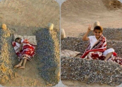 حقيقة صورة "الطفل النائم بين قبري والديه"