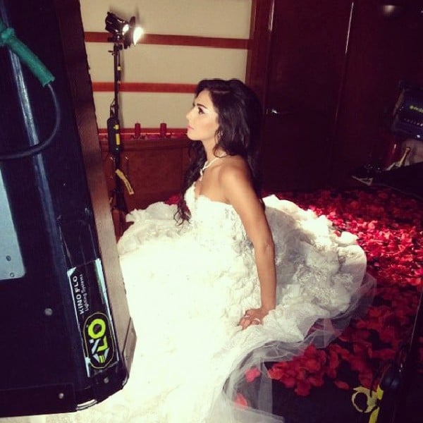 ارتدت الفنانة الأردنية ميس حمدان فستان الزفاف الأبيض وبدت فاتنة للغاية لكن معدات التصوير تحيط بها .