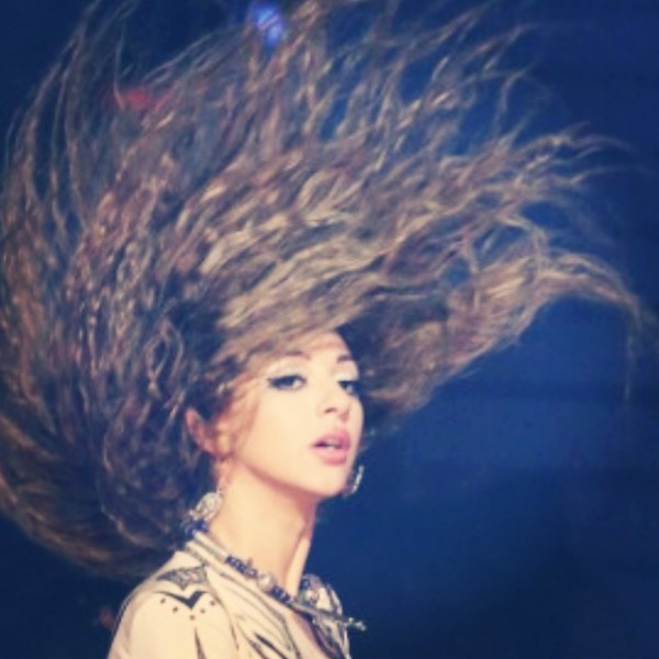 وتبدو ميريام في الصورة منسجمة في الرقص على المسرح وشعرها طائرا لأعلى .
