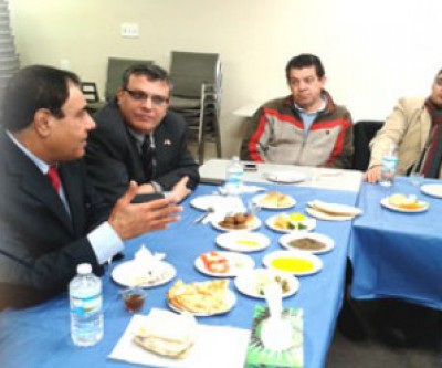 وفي اليوم التالي " الجمعة 17 يناير 2014 " كان الدكتور عز الدين أبو العيش ضيفا على الجمعية الفلسطينية الكندية بمدينة لندن/أونتاريو على مائدة إفطار فلسطينية " فلافل وحمص ومقبلات فلسطينية" كان في مقدمة مستقبلية الدكتور/ جهاد حمد رئيس الجمعية و،السيد/ إيهاب شقفة رئيس الجمعية العربية بالمدينة ولفيف من أبناء الجالية الفلسطينية والعربية، ودار حول المائدة حديث ذو شجون فلسطينية وكيفية السمو بالقضية وطريقة التعامل مع العقول الغيرعربية في شرح الحق الفلسطيني وعدم ترك الفرصة للأعداء كي يغيروا الحقائق ويقلبوا المفاهيم الأصيلة للحق الفلسطيني في الأرض وفي الحياة.
