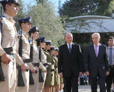 استقبل شيمعون بيرس، أمس الإثنين، في مقر رئاسته الرئيس الروماني ترايان باسيسكو الذي يزور إسرائيل حاليا. وخلال حفل الاستقبال صرح الرئيسين لوسائل الاعلام، ومن ثم قاموا بالاجتماعات التي تمحورت حول عملية المفاوضات الاسرائليلة الفلسطينية.