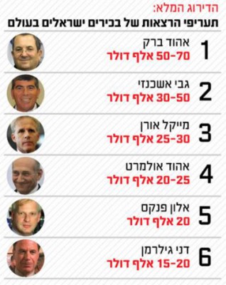 بعد ان اعتاد العديد من المسؤولين العسكريين والسياسيين الاسرائيليين في اعقاب الانتهاء من عملهم الرسمي كموظفي دولة، بإلقاء المحاضرات خارج اسرائيل، لقاء مقابل مالي، فقد ذكر موقع "واللا" الاخباري العبري ان وزير جيش الاحتلال السابق "ايهود باراك" يحتل المرتبة الاولى من حيث الاعلى اجراً عن كل محاضرة يلقيها خارج اسرائيل حيث يتقاضى مبلغ ما بين 50-70 الف دولار عن المحاضرة الواحدة.