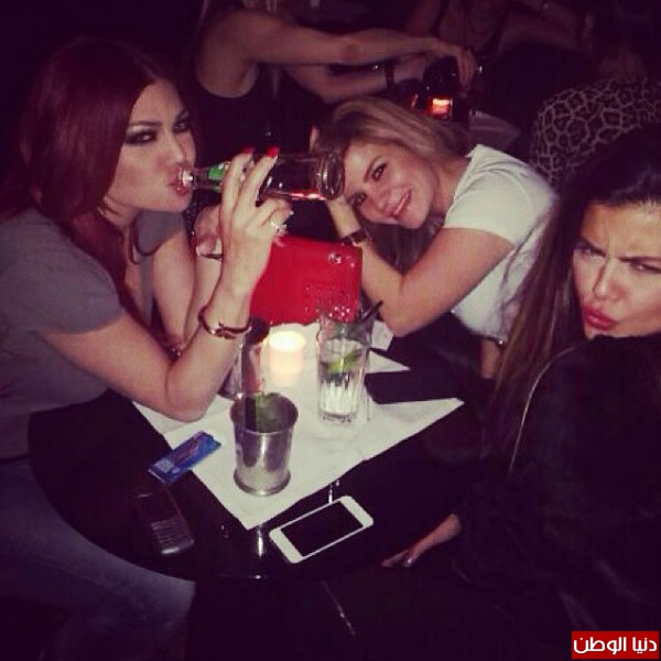 وتألقت بفستان جلدي أسود وحقيبة حمراء تلائم لون شعرها , وصورة أخرى وهي تمرح مع صديقاتها في إحدى النوادي في باريس وتحتسي مشروب أثار الجدل إذا ماكان عصير أو نبيذ .