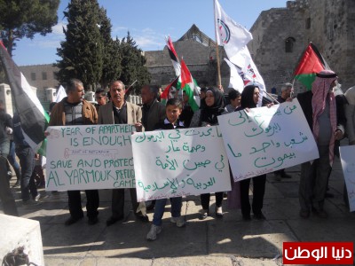 حيث طالب المتضامنون برفع الحصار عن المخيم وإدخال الاغاثة الى اهلنا وتوفير العلاج للمرضى , حيث تحدث الرفيق جورج حزبون القيادي في الجبهة وعضو مجلس بلدية بيت لحم حيث أكد أن الهجمة التي يتعرض لها مخيم اليرموك هي ضمن اجندة سياسية تستهدف تصفية حق شعبنا بالعودة الى دياره وطالب المؤسسات الانسانية والقانونية بالعمل والضغط على رفع الحصار الذي يتعرض له المخيم .