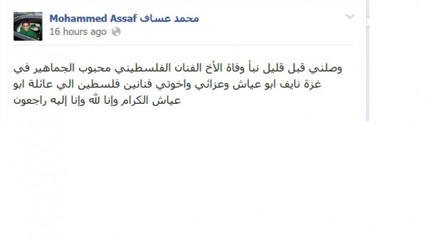 وكتب عساف عبر صفحته : " وصلني قبل قليل نبأ وفاة الأخ الفنان الفلسطيني محبوب الجماهير في غزة نايف ابو عياش وعزائي واخوتي فنانين فلسطين الي عائلة ابو عياش الكرام وإنا لله وإنا إليه راجعون " .