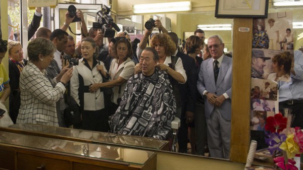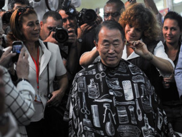 في لقطة طريفة للأمين العام للأمم المتحدة بان كي مون، ظهر الأخير في أحد صالونات الحلاقة بهافانا في كوبا، وهو يقص شعره. إلا أن الظريف في تلك اللقطة، التي نشرتها وكالة الأنباء الفرنسية، أن النساء تجمعن حول الضيف الأممي، فيما راح آخرون يلتقطون له الصور، احتفاء بمجيئه على ما يبدو. أما بطلة الصورة فكانت بالتأكيد، المرأة التي قصت شعر الزبون "العالمي".