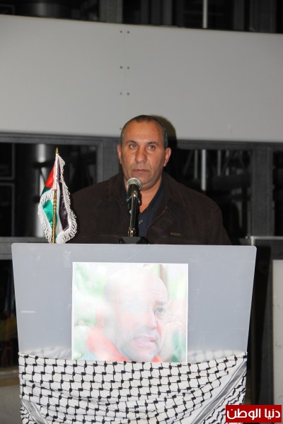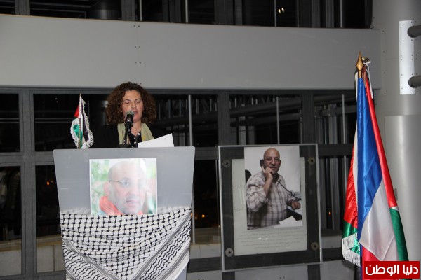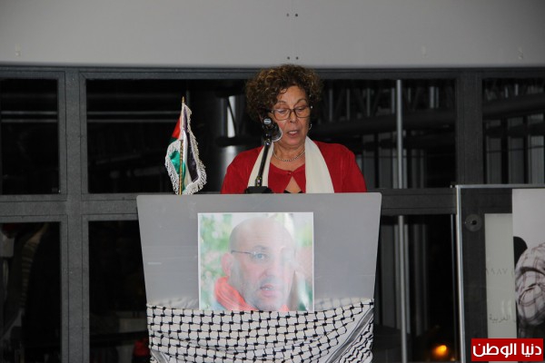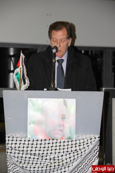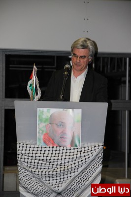 حيث شدد أن وفاته خسارة للشعب الفلسطيني وأن كل من عرفه من شعبنا الآن يبكيه كما وعلا صوت القائد خفاقاً من وراء القضبان ليسمعه كل المحتشدون إنها كلمة القائد مروان البرغوثي التي كانت صورته حاضرة بين الحضور عبر شاشه كبيرة في داخل القاعة حيث تحدثت نيابتاً عنه الأخت نهى رشماوي الذي بدوره وبكلمات مليئة بالحزن والأسى نعى الفقيد وشهد له بإنجازاته وتضامنه مع القضية الفلسطينه والدور الذي كان يلعبه في كل الميادين وتضامنه مع القائد مروان البرغوثي الذي أوصل صورتة في كل مدينة ومنطقه وبلدية ومؤسسة الا ورفع صورته داخلها وعلى أثر عملة منح القائد مروان البرغوثي كثير من مواطنه الشرف في بلديات كثيرة بفرنسا كما