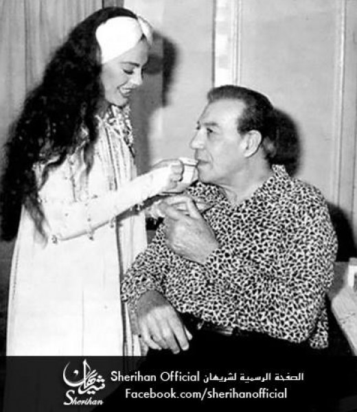 حيث كانت شريهان تقدم له فنجان القهوة التركي الذي اعتاد على شربه , وذلك في كواليس مسرحية " شارع محمد علي " .