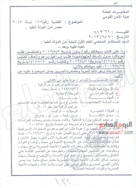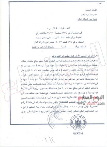 الحلقة الأولى من التحقيقات التى تنشرها «اليوم السابع» تتضمن النص الكامل لتحريات جهاز المخابرات العامة المصرية عن العملاء المصريين المتهمين بالتخابر لصالح جهاز المخابرات العسكرية الإسرائيلية، وهو التقرير الذى اعتمدت عليه نيابة أمن الدولة العليا فى توجيه الاتهامات إلى العملاء المصريين، خاصة أنه يتضمن معلومات تفصيلية عن الجواسيس المصريين، وقصة تجنيدهم، وجميع المعلومات التى نقلوها لإسرائيل عن تحركات الجيش المصرى فى سيناء، ويتكون التقرير من 56 ورقة مقسمة إلى جزأين، الأول 34 ورقة، ويتعلق بالمتهم الأول عودة طلب إبراهيم، بينما يضم الجزء الثانى 22 ورقة، ويتعلق بالمتهمين الثانى والثالث سلامة حامد فرحان أبوجراد، ومحمد أحمد عيادة أبوجراد.