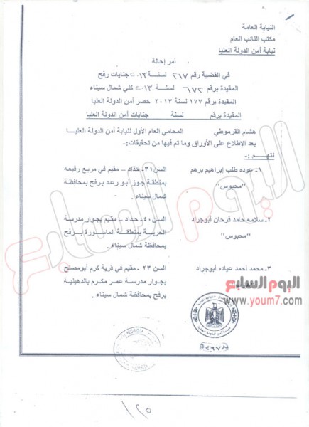 «1» المدعو صالح أبوالحسن المنيعى، مقيم بمنطقة المهدية، رفح، من قبيلة السواركة.