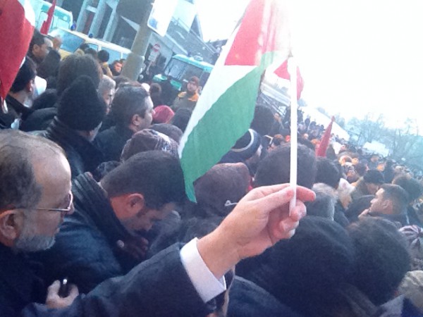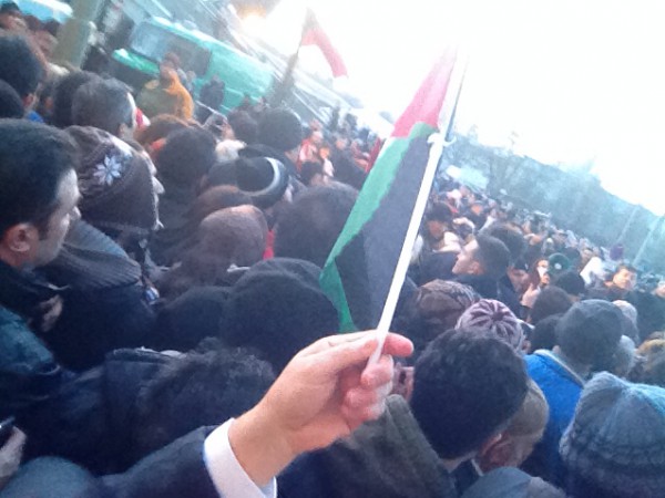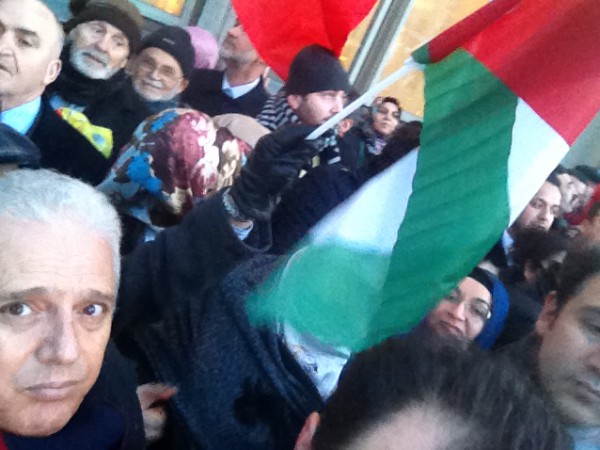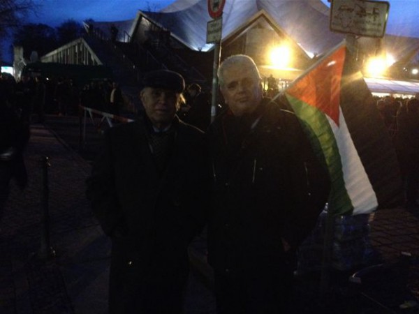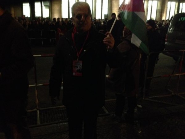 وواضاف:سلمنا حرمه علم فلسطين.. بعد أن سمعت منه كلمة فلسطين وشاهدت العلم.. وزوجه بعفوية حين قالت: الله الله الله.. فلسطين.. وقدمنا العلم لها هدية.. الذي ضمته ورفعته أمام الحشد...!!