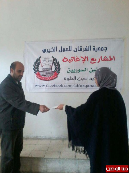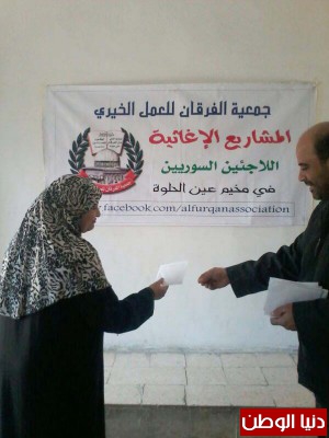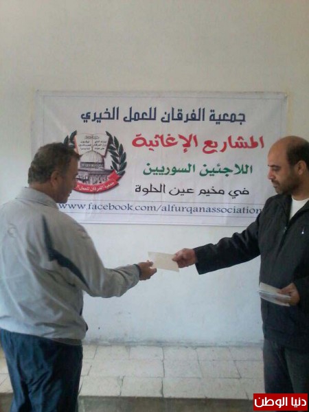 قامت جمعية الفرقان للعمل الخيري في مخيم عين الحلوة يوم الخميس الواقع في 6/2/2014 في مكتبها في مركز الفرقان لإيواء النازحين بصرف مبالغ جديدة لأصحاب الطلبات المقدمة لها في شهر 1/2014 الخاصة بالمساهمة بدفع فاتورة الإستشفاء للنازحين من سوريا الى مخيم عين الحلوة وتأتي هذه الدفعة ضمن سلسلة من الدفعات التي تقدمها الفرقان للحالات المرضية من النازحين.