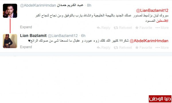 قام الفنان السوري عبد الكريم حمدان بالمباركة للفنانة الفلسطينية الصاعدة ليان بزلميط بمناسبة صدور أول أغنية لها باللهجة الخليجية .