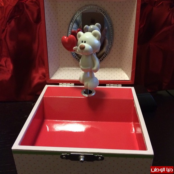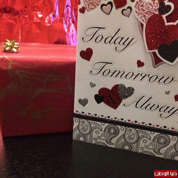 حيث كتب لها :" زوجتي .. حياتي ..بالشتا وبالصيف .. وهلأ صار عنا ضيف .. خلا حياتنا كلا كيف .. هابي فلنتاين ماي فالنتينا " .