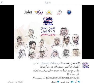 عمل إبداعي ومتميز سـينطلق اليوم الخميس بإذن الله في الأردن على مسرح"جامعة العلوم التطبيقية" يستهدف مخيمات اللاجئين من بلاد الشام .."جايين نسعدكم" حملة إنسانيّة تنطلق من الخليج هدفها الوحيد هو إسعاد أيتام سوريا اللآجئين في الأردن سيتم تصوير جميع فعاليات الحملة في يومها الأول والثاني والكواليس واللقاءات مع المشاركين .. ثم سيتم توزيعها مجاناً على ٤٠ قناة فضائية.