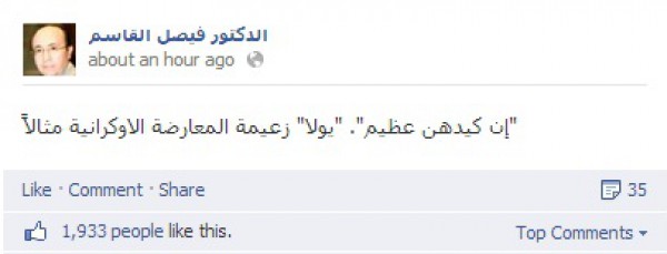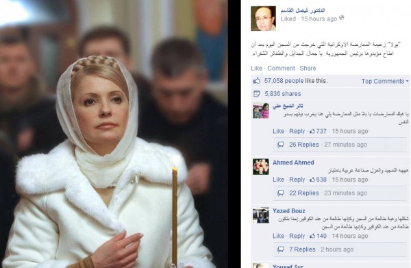وكتب القاسم على صفحته على الفيسبوك إطراء على الزعيمة يولا تيموشنكو مرفقا بصورتها،قائلا :"يولا" زعيمة المعارضة الاوكرانية التي خرجت من السجن اليوم بعد أن اطاح مؤيدوها برئيس الجمهورية. يا جمال الجدايل والظفائر الشقراء".