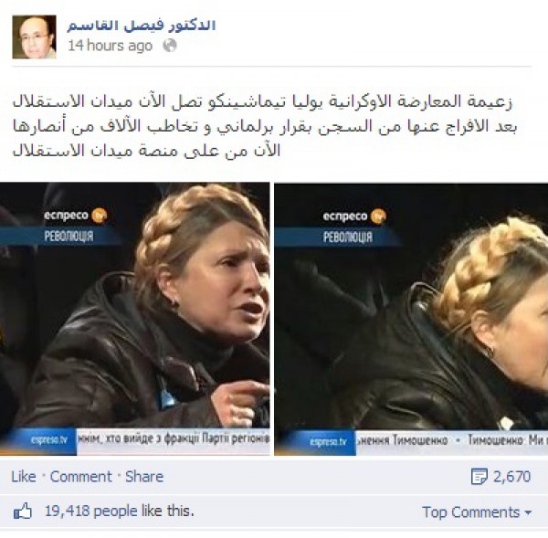 أثارت الاحداث المتلاحقة في أوكرانيا مؤخرا اهتمام النخبة العربية لما لها من تأثيرات هامة على الوضع الدولي والإقليمي والعربي خاصة في سوريا.ومن بين النخبة التي لاحقت الاحداث والتحليلات حول الوضع الاوكراني الإعلامي السوري د.فيصل القاسم الذي أولى الاضطرابات الاوكرانية اهتماما خاصا على صفحته على الفيسبوك،حيث أخذ القاسم في تحليل الاحداث الهامة والرئيسية التي تدور في البلاد في عبارات مقتضبة ورسائل سياسية مباشرة.