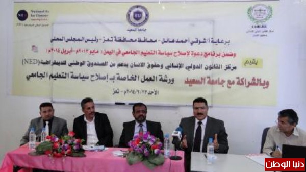 انعقدت اليوم بتعز ورشة العمل الخامسة بعنوان إصلاح سياسة التعليم الجامعي في اليمن ضمن برنامج دعوة لإصلاح سياسة التعليم الجامعي والذي ينفذ من قبل مركز القانون الدولي الإنساني وحقوق الإنسان وبدعم من الصندوق الوطني للديمقراطية في نطاق سبع محافظات يمنية وبالتنسيق مع وزارة التعليم العالي .