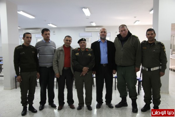 العميد أركان حرب فتحي التايه قائد منطقة جنين وطوباس، يرافقه مجموعة من الضباط وصف ضباط وجنود الأمن الوطني الفلسطيني مدير مدرسة ذكور عز الدين الأساسية الأستاذ وليد