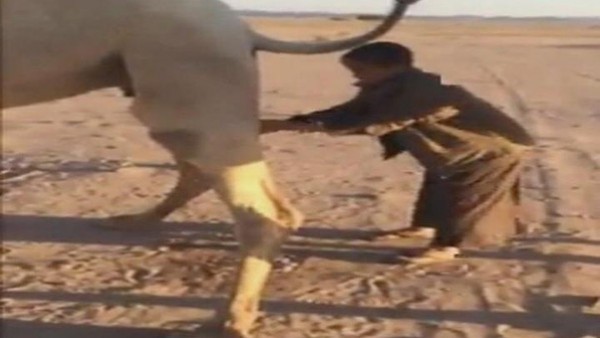 تداول مغردون على مواقع التواصل الاجتماعي، فيديو يظهر طفلاً اقترب من ناقة وقام يغتسل من بولها.