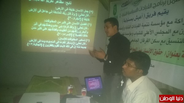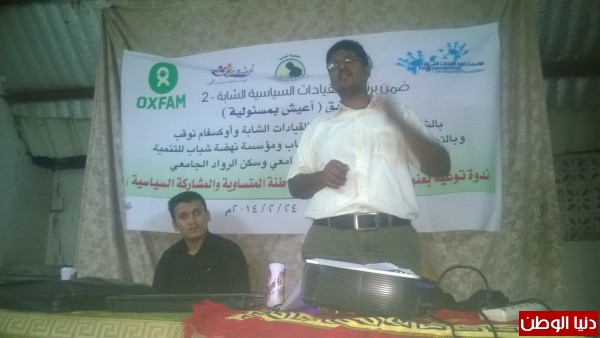 أختتم فريق أعيش بمسئولية بمحافظة الحديدة يوم أمس ندوات توعوية حول حقوق الإنسان بين المواطنة المتساوية والمشاركة السياسية والذي نفذ ضمن برنامج القيادات السياسية الشابة 2 والتي تقام بالشراكة مع مؤسسة تنمية القيادات الشابة وأوكسفام نوڤبو والمجلس الأعلى للشباب وأستهدفت الحملات التوعوية التي أستمرت شهر مايقارب 500 شاب وشابة من مختلف المديريات " الحالي - الحوك - الميناء - المراوعة " .