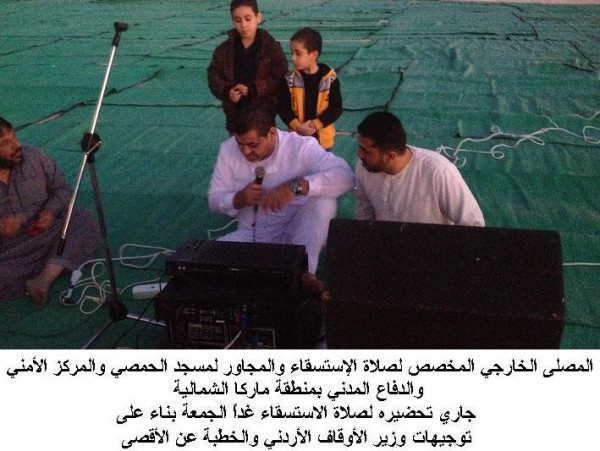هذا ومن جهة أخرى يقوم مسجد الحمصي بماركا الشمالية بتحضير المسجد والمصلى لخطبة صلاة الجمعه يوم غد والتي ستكون عن الأقصى ومن ثم أداء صلاة الإستسقاء بناء على توجيهات وزير الأوقاف والشؤون والمقدسات الإسلامية الأردني الدكتور هايل داوود ..إذ يقوم المسلمون في حالة انحباس الأمطار اقتداء بالسنة النبوية الشريفة بأداء صلاة الاستسقاء فيتوجه المسلمون الى المصليات لاداء الصلاة وسماع الخطبة التي يلقيها الخطيب فيما تكون وزارة الاوقاف والشؤون والمقدسات الاسلامية قد جهزت مصليات الهواء الطلق في هذا الوقت عوضا عن المساجد في كافة احياء المملكة تخفيفاً على المواطنين من الاكتظاظ في المساجد حيث تكون أعداد المصلين وقتها كبيرة جداً ويصعب على المساجد التابعة للمناطق احتواء هذه الاعداد لمهوله من المصلين .وفي ذات السياق يقوم إمام وخطيب مسجد فاطمة الزهراء الشيخ خالد العجارمة بماركا الشمالية حي العبداللات بتجهيز المسجد لصلاة الاستسقاء وخطبة الجمعه حول الأقصى ايضاً .