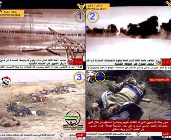 وقالت صفحة الثورة السورة أن البسيط الذي لا يفقه كثيراً في الأمور العسكرية يستطيع وبمقارنة سريعة للفيديوهات التي بثها اعلام النظام وحزب الله أن يرى مايلي: