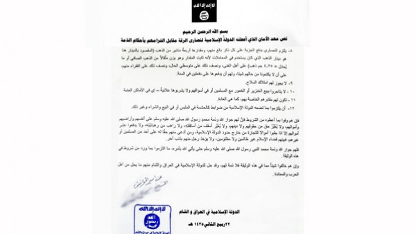 أعلن تنظيم "الدولة الإسلامية في العراق والشام" (داعش)، الأربعاء، أنه فرض سلسلة من الأحكام على السكان المسيحيين في مدينة الرقة السورية، التي سيطر عليها، وفرض عليهم دفع "الجزية" وإقامة شعائرهم في أماكن خاصة. وأعلنت "داعش" التوصل إلى "اتفاق" يتضمن 12 قاعدة تهدف إلى ضمان ما أسمته "حماية" المسيحيين، مهددة بأن أي أحد لا يحترمها سيعامل باعتباره عدواً.
