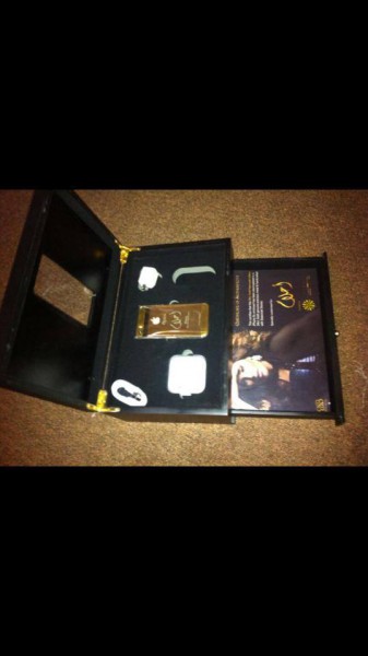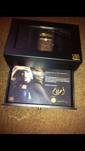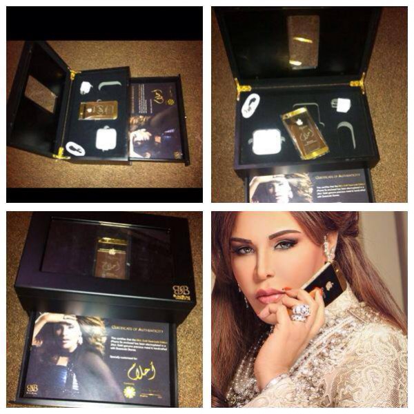 حيث نشرت الصور عبر الفيس بوك وكتبت:” هديه تليفون من الذهب الخالص عيار ٢٤ مرصع بالألماس من شركه bbluxury الف شكر لهم التيلفون رائع وكأنه تحفه فنيه ماشاء الله ” .