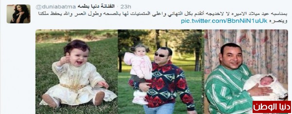 حرصت الفنانة المغربية دنيا بطمة على تهنئة ملك المغرب محمد السادس بعيد ميلاد ابنته الأميرة للا خديجة بعيد ميلادها السابع .