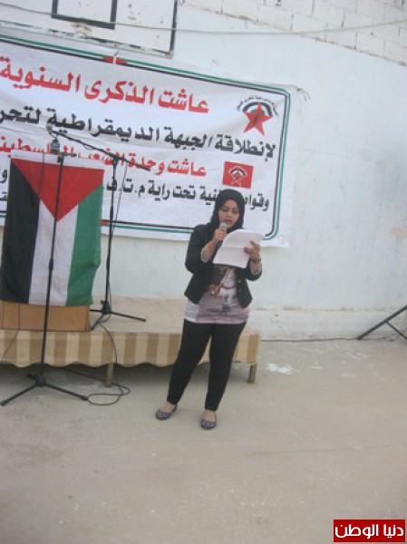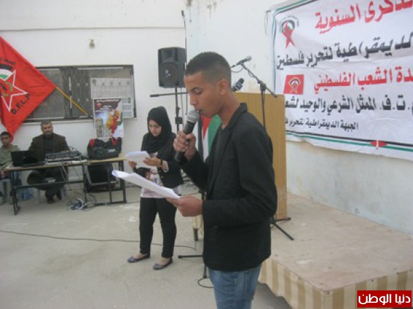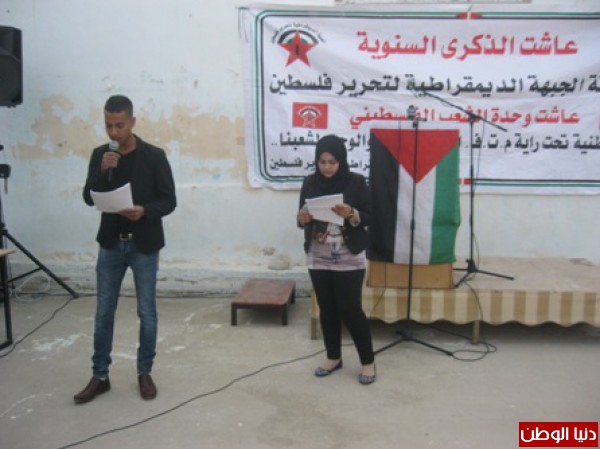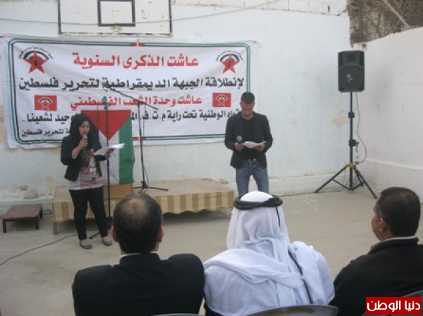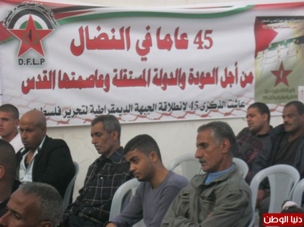نظمت الجبهة الديمقراطية لتحرير فلسطين حفل بمناسبة الذكرى 45 لانطلاقتها في مقرها وسط مخيم عقبة جبر بحضور عضو المكتب السياسي محمد سلامة وعضو اللجنة المركزية للجبهة الديمقراطية ونائب محافظ محافظة اريحا جمال رجوب وممثلي فصائل العمل الوطني بالمحافظة و قيادة منطقة اريحا والاغوار العلاقات العامة والاعلام الرائد كمال دوايمة مدير العلاقات العامة في الامن الوطني الفلسطيني اريحا وعضو المجلس الوطني اسماعيل ابو داهوك ورئيس بلدية اريحا محمد جلايطة والرفيق مصطفى بلهان القيادي في الجبهة الديمقراطية وممثلي عن المؤسسات الاهلية والرسمية