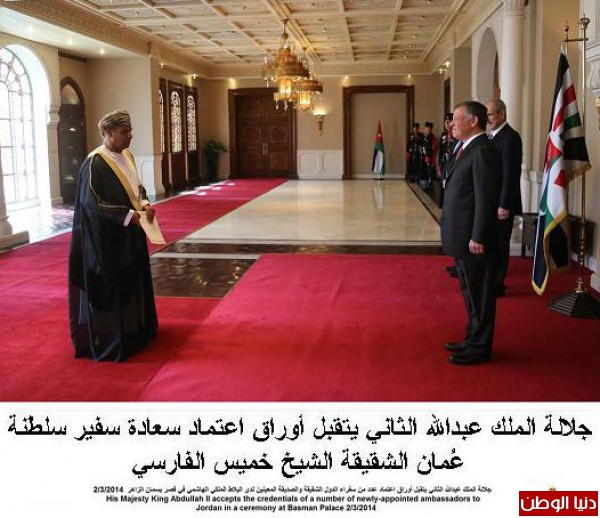 الملك عبدالله الثاني يتقبل أوراق إعتماد سفير سلطنة عُمان لدى الأردن الشيخ خميس بن محمد بن عبدالله الفارسي