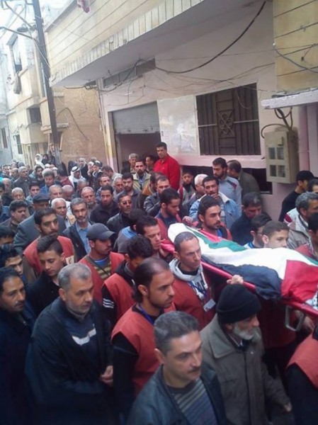شيعت جماهير فلسطينية غفيرة في مخيم العائدين بمدينة حمص السورية جثمان شاعر الثورة الفلسطينية إبراهيم محمد صالح الشهير بـ"أبو عرب" ظهر اليوم الاثنين.