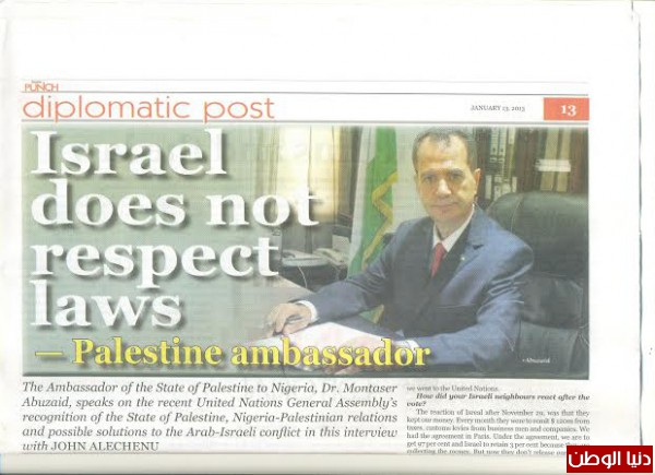 دنيا الوطن سلطت الضوء على ملف العلاقات الفلسطينية النيجيرية من خلال التطرق إلى العلاقات السياسية والدبلوماسية الفلسطينية النيجيرية ،السفارة الفلسطينية في نيجيريا ،الجالية الفلسطينية ،وزيارة الرئيس النيجيري إلى فلسطين مؤخرا من خلال مقابلة مع سعادة السفير الفلسطيني في نيجيريا د.منتصر أبوزيد في الحوار التالي: