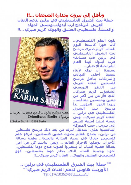 يسعدنا أن نزف لأبناء شعبنا أحلى التهآني والتبريكات بتآهل مرشح فلسطين الفنان العربي من القطر التونسي الشقيق.. كريم صبري.. الذي فاز من بين أكثر من مئتين وخمسين متنافسا.. وبهذا الفوز المؤور.. بدأ مرشح بيت الشرق الفلسطيني في برلين .. الفنان كريم صبري.. بهيئ نفسه ليشد أمتعة السفر إلى بيروت.. حيث المعركة التنافسية على أشدها.. لنرى من بعد ذلك مرشح فلسطين من برلين.. يصدح للعالم بصوت عشق فلسطين.. ليرفع علم فلسطين خفاقا في سماء العدالة والحرية.. وهذه رسالة الأحرار.. نوصلها للأحرار العالم .. ونحن نناشد كل من آمن بعدالة قضية أمتنا.. أن ينتصروا لصوت صدح دوما لفلسطين.. أخونا وحبيبنا الفنان الذي يحلم دوما بفلسطين.. فهو فلسطيني العشق والهوى.. الفنان كريم صبري...!!