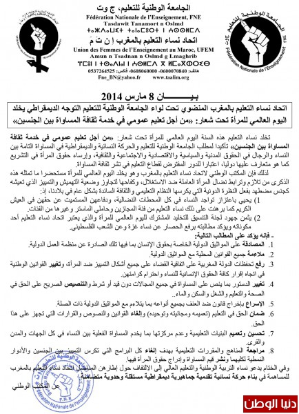 لذلك فإن المكتب الوطني لاتحاد نساء التعليم بالمغرب وهو يخلد اليوم العالمي للمرأة مستحضرا ما تمثله هذه الذكرى من تلازم وترابط نضال المرأة العاملة ضد الاستغلال، وكفاحها لتجاوز وضعية التهميش والتمييز الذي تعيشه كجنس مضطهد بفعل النظرة الدونية التي يكرسها النظام التعليمي والثقافة السائدة بشكل عام في بلادنا، إذ: