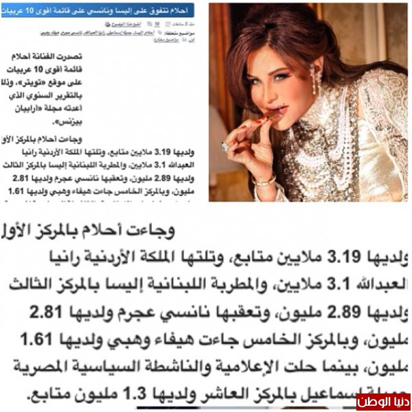 وبلغ عدد المتابعين لها 3,19 شخص , وحلت في المركز الثالث الفنانة اللبنانية إليسا بـ2,89 متابع , وبعدها مواطنتها نانسي عجرم بـ2,81 وهيفاء وهبي جاءت في المركز الخامس بـ1.3 متابع .